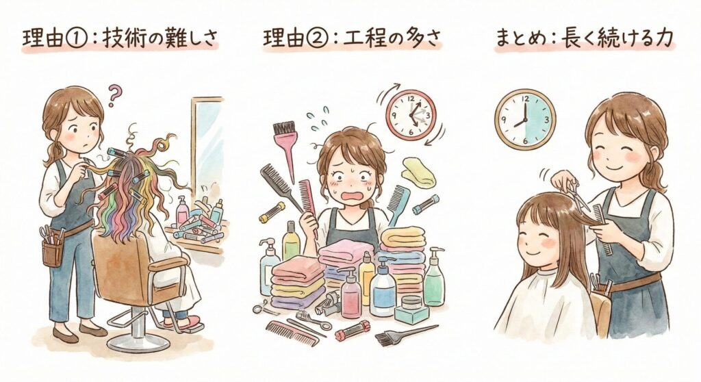 この記事では、当サロンがパーマをメニューから外している理由、それがスタッフの働きやすさとお客様満足度にどう直結しているかを、オーナー自身の言葉でお伝えします。「技術を磨きたいけど、無理なく長く続けたい」と思う美容師さんへ向けた、うちのサロン哲学の話です。